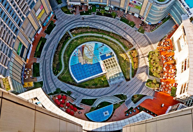 现在,把视线转向地上商业部分,与其他常规商业项目设计不同的是,本该是大中庭的位置,日月光中心广场把它做成了露天花园。正是因为露天花园的存在,该项目看起来就像是汉字中的“回”字。由于体量较大,经营者又把“回”字型商业物业像切蛋糕一样分成了三部分,经营者根据毗邻的马路为其命名,以期消费者能准确判断所在位置。露天花园设置了四个出入口,中心位置的出入口衔接地下一、二层商业,周边的三个出入口与徐汇路、泰康路、瑞金路连通。