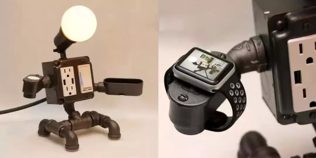 看起来就有着浓烈的19世纪的工业时代风格,可是功能强大,它提供了照明、电源插头、手机支架、还有替手表无线充电等功能,装饰性与实用性俱佳,摆放在床头非常合适。