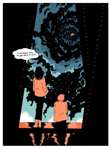 同时,不管在纸质印刷还是电子屏幕上,书里的太空并不是仅用黑白两色表示的。它由橙色、黄色和紫色的日落色调组合在一起,偶尔呈现暗褐色。 线条和色调共同构成了一种凝聚力,这种凝聚力可以让本书在破碎废墟、寄宿学校、边境定居点、魔法森林之间跳跃自如。