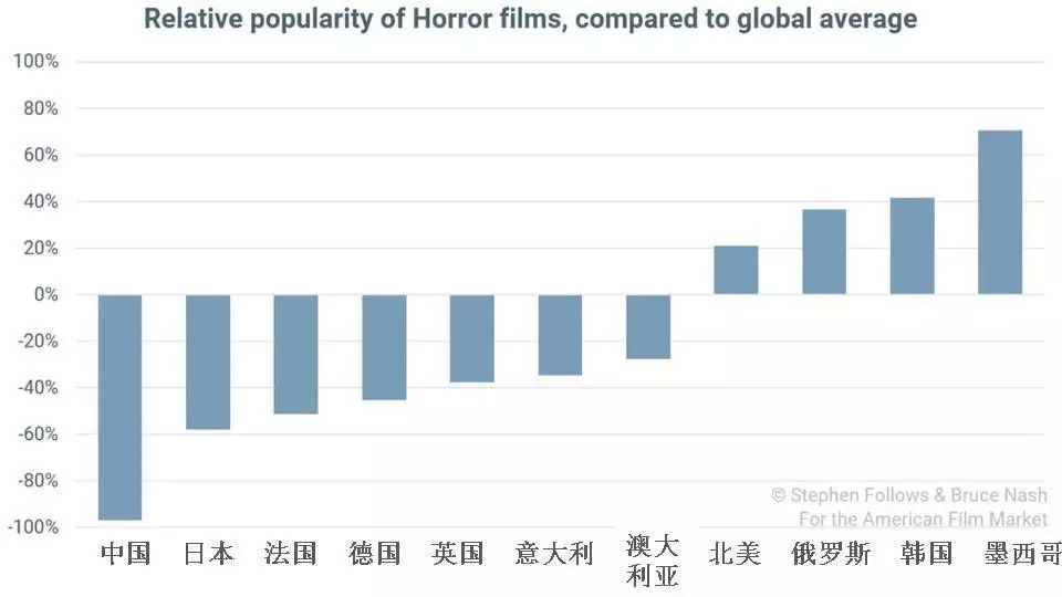 墨西哥和韩国的电影观众是全世界恐怖片的最忠实拥趸,而恐怖片在日本和中国的票房表现则不怎么好。