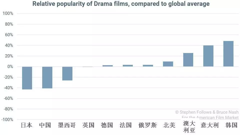 4. 剧情片在韩国的票房表现是最好的。墨西哥、日本和中国对此就不太感冒了。