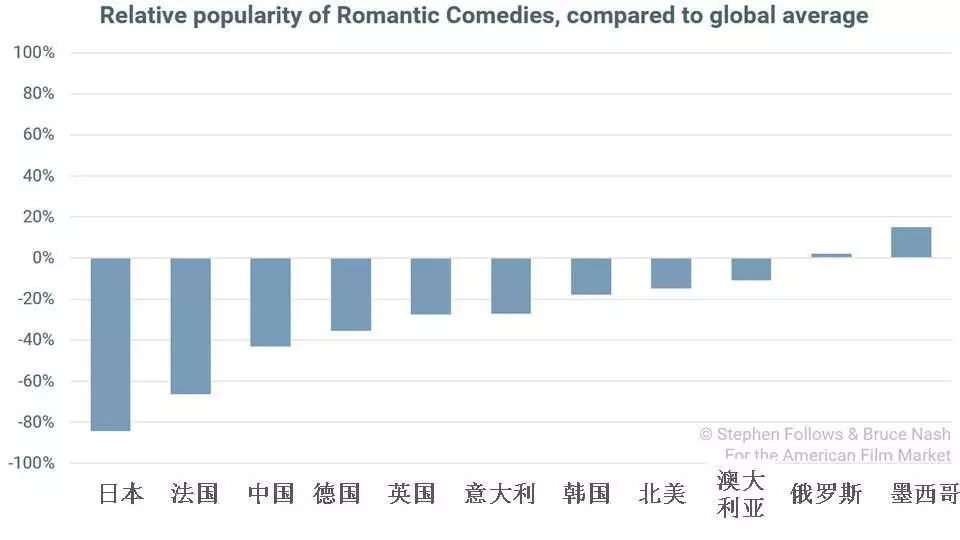 5. 爱情喜剧对于墨西哥市场来说是极其受欢迎的,在俄罗斯也同样极受欢迎,日本和法国观众对于爱情喜剧的兴趣就比较小。