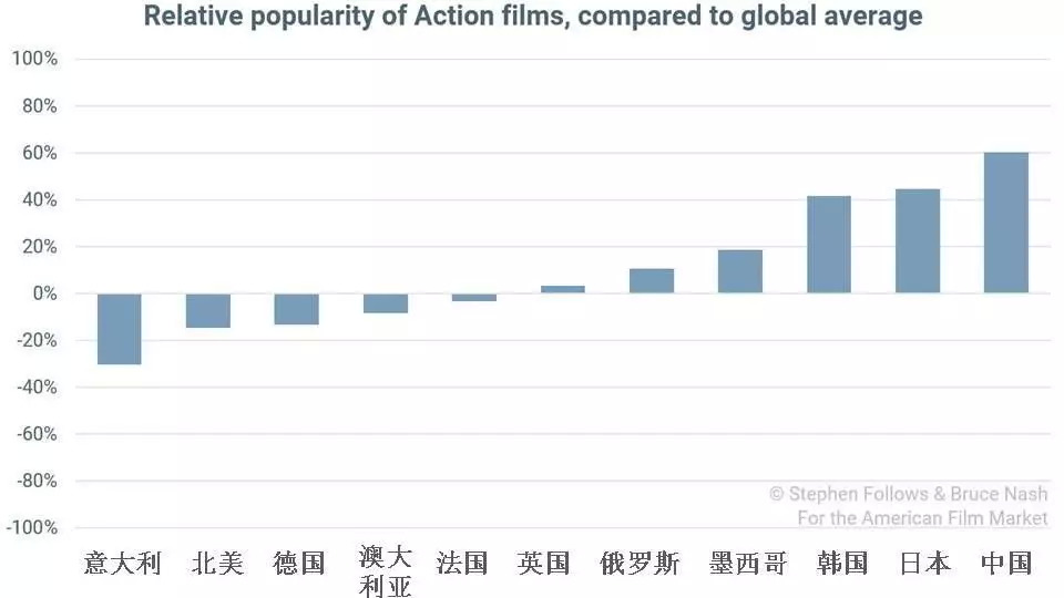 在下文的统计图表中,零表示某种类型在全球平均的票房表现,因此,某一地区的正数统计值即表示此类电影在该地区的表现优于全球平均水平。