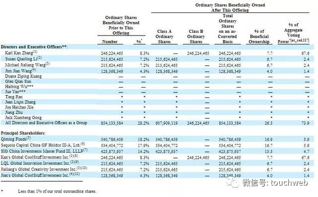 红杉资本持股为16.7%,为第二大股东,拥有5.9%的投票权,SIG中国持股为13.3%,为第三大股,拥有4.7%的投票权。