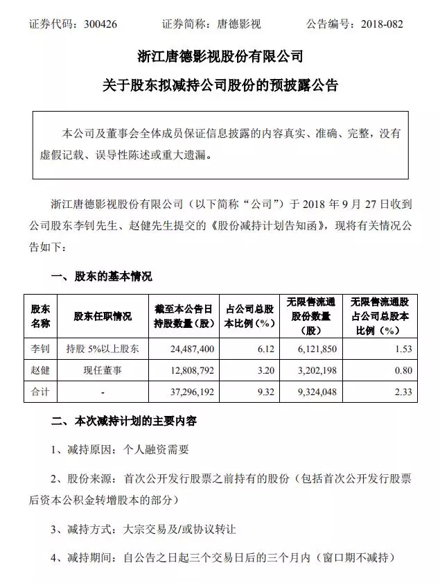 9月27日晚间,唐德影视发布公告称,今日收到了公司股东李钊、赵健提交的《股份减持计划告知函》,因个人融资需要,两人拟自三个交易日后的三个月内,分别减持不超612万股(占公司总股本的1.53%)及320万股(占公司总股本的0.80%);其中,李钊作为持股5%以上的股东,当前持股6.12%,赵健作为公司现任董事,当前持股3.2%。