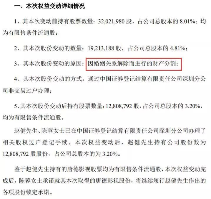 2017年10月10日,唐德影视突然发布公告,称其董事赵健因与妻子陈蓉协议离婚,现将其持有的3202.2万股(占公司总股本的8.01%)上市公司股票分割。赵健本人保留1280.88万股,占公司总股本的3.20%;妻子陈蓉分得1921.32万股,占公司总股本的4.81%。