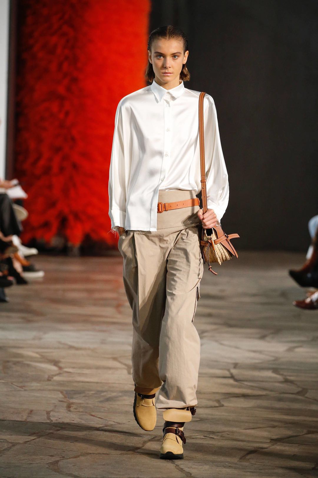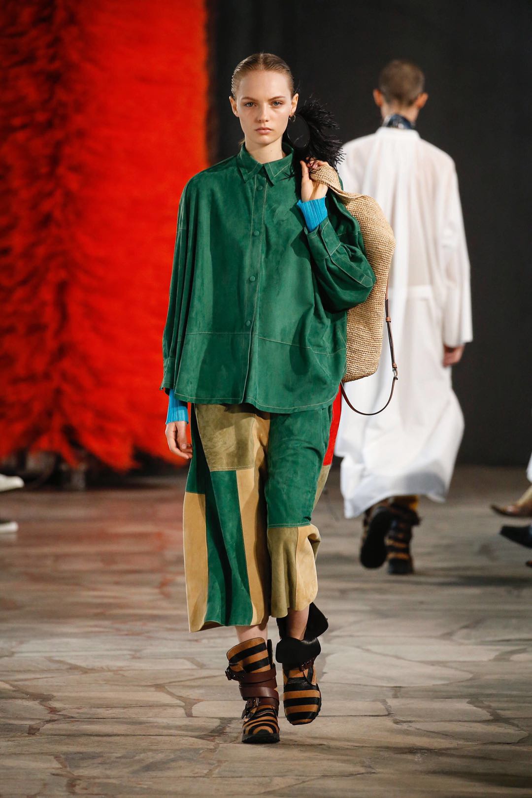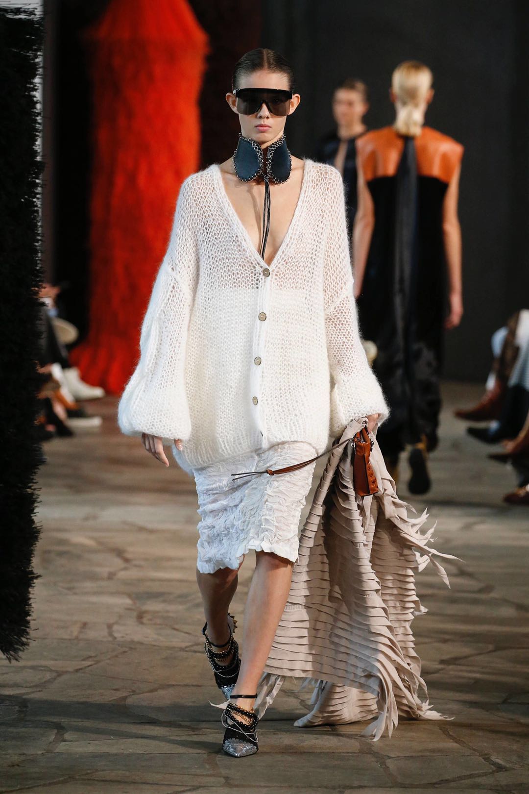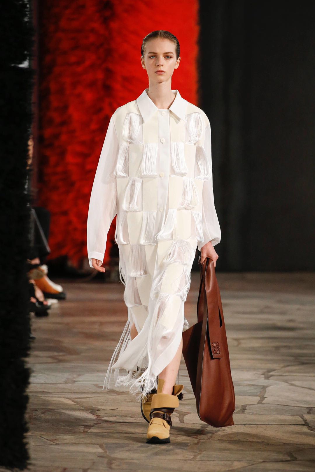 更为人们关注的是Loewe的包袋,Anderson用“图腾”一词语形容它们,编织手工流动在包袋的各个角落。除了精致的皮革小包,一些有趣的元素出现在编织包上。例如在皮革草编拼接袋上,镶有一些巨大的“钻石”,还有长而密的毛出现在包袋上。造型师提供的参考背法是巨大编织袋和皮革小包叠背,甚至还有迷你包型的皮革项链。