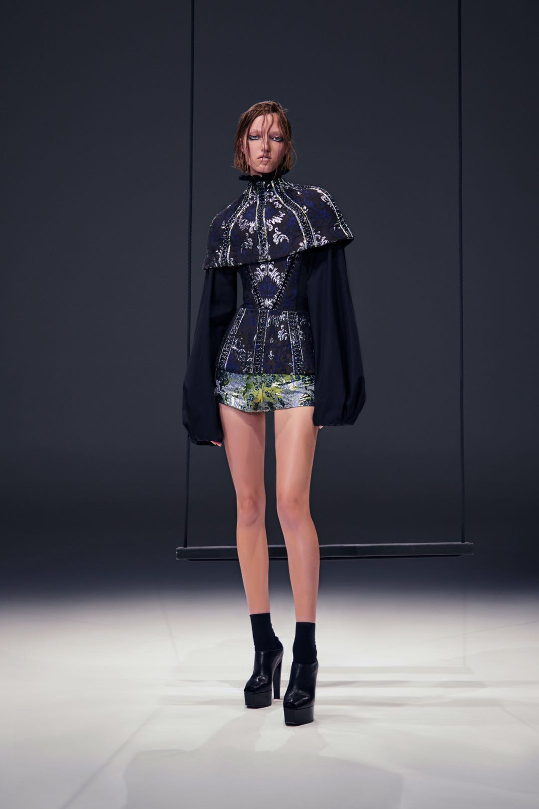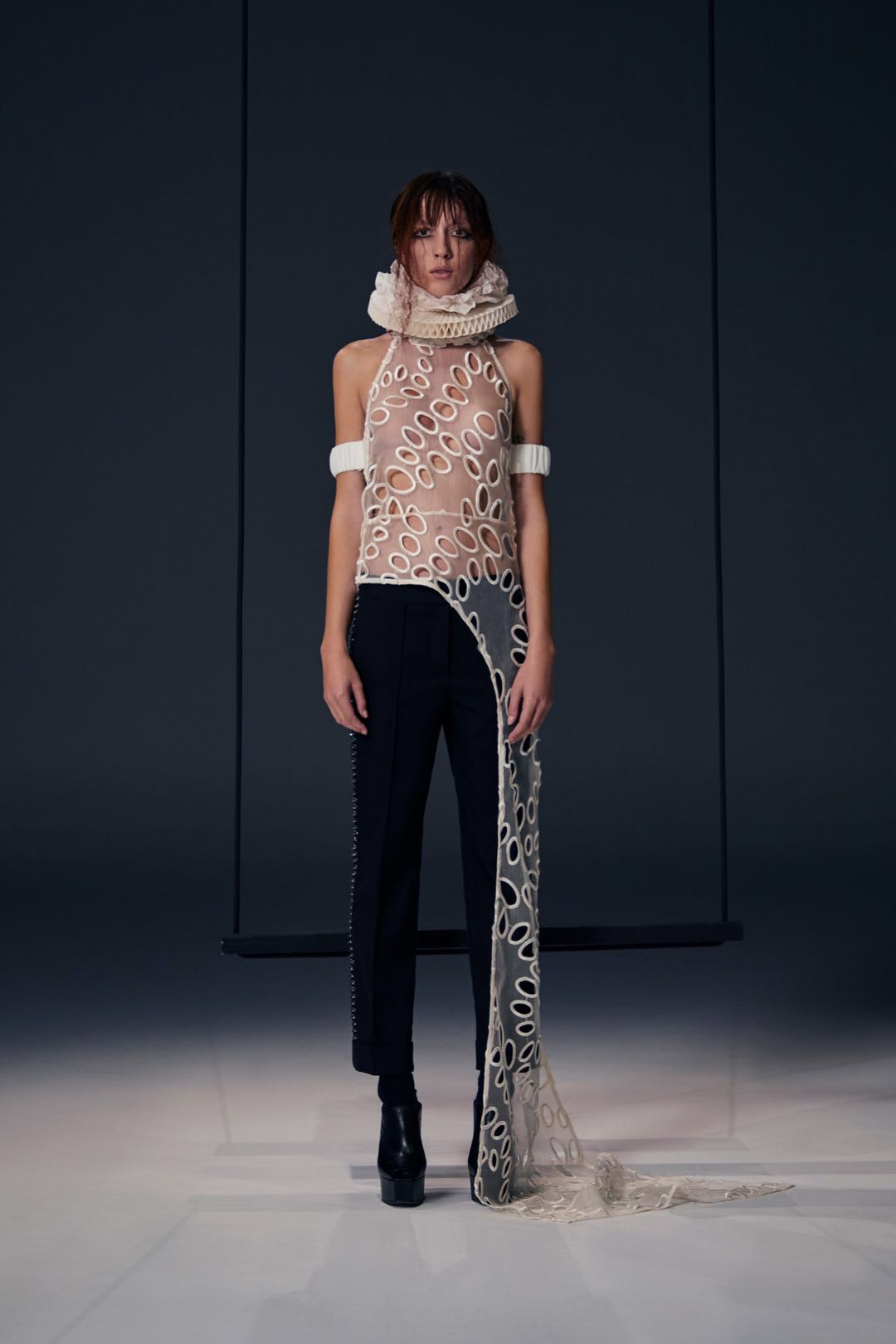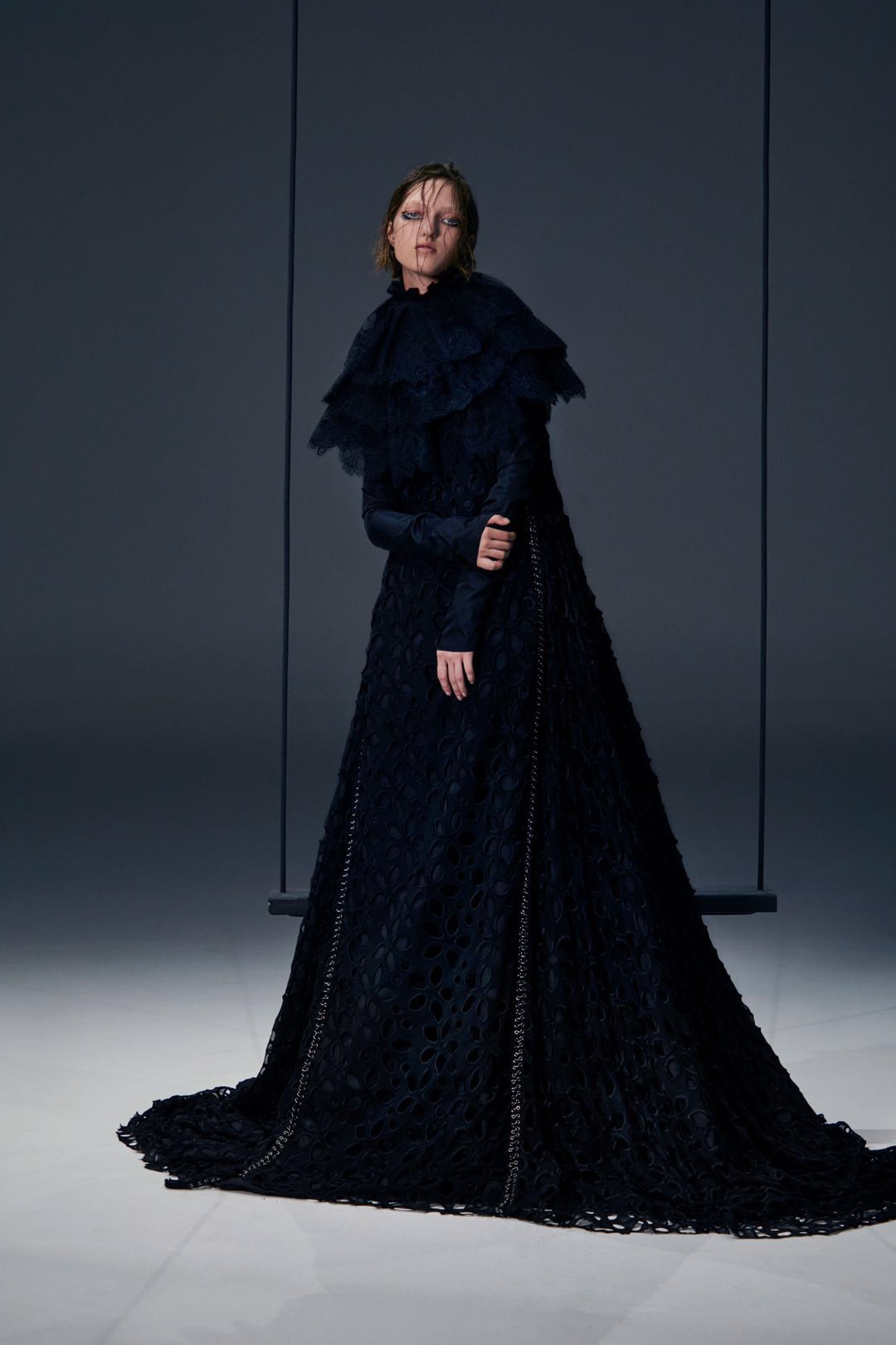 这一系列中也有一些现代化的款式,例如旧式贵族衣领与不对称透视镂空内搭的混合,除了色彩相合之外还是有些怪诞。但如今,这种衣领作为颈饰,反而让现代化着装增添了一些庄重感和仪式感,而这些都是Vera Wang在婚纱之外无法丢弃的设计风格。