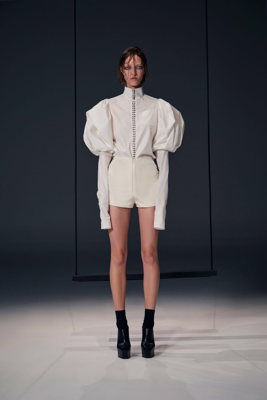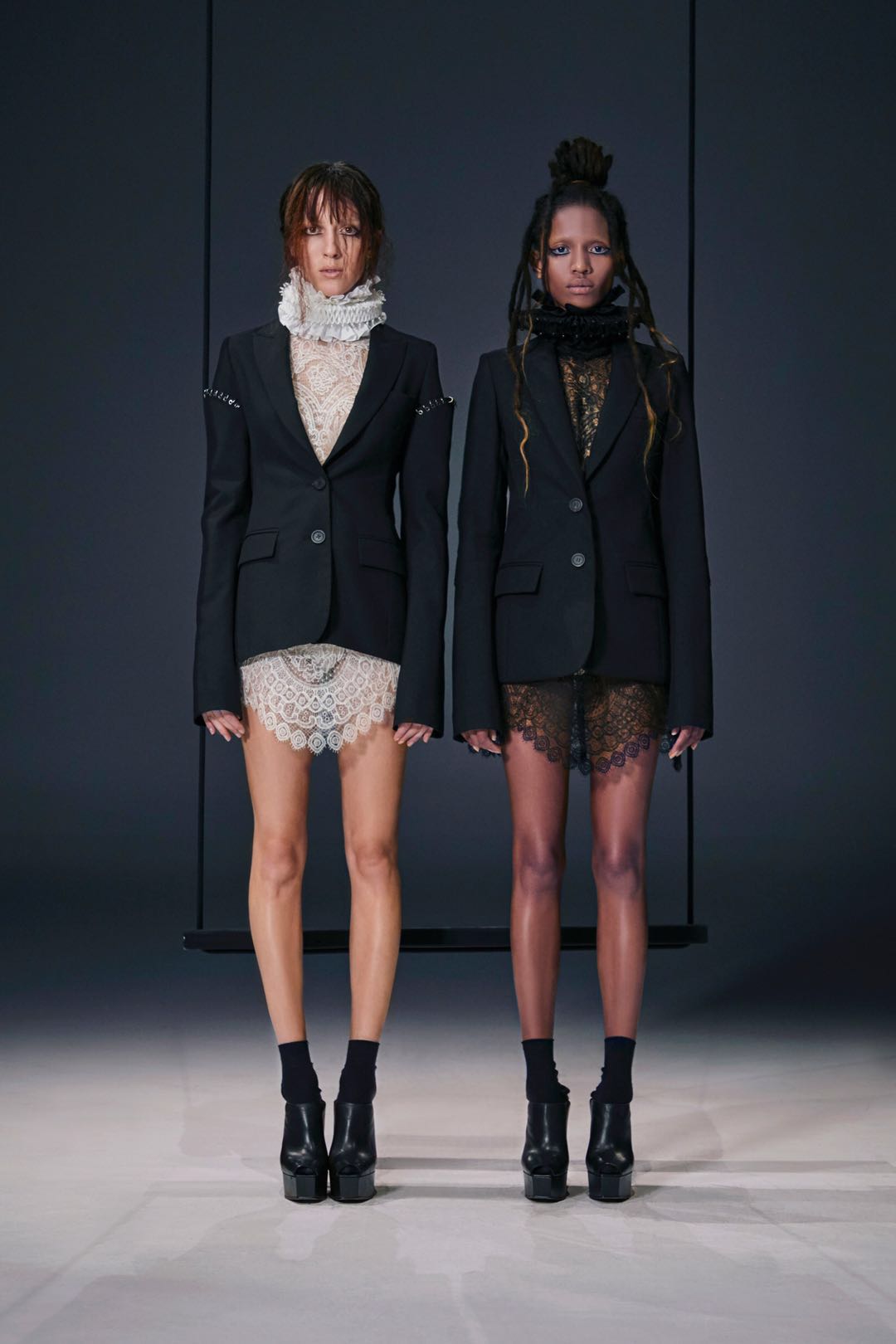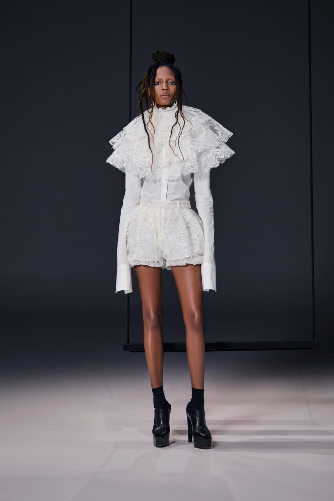 这一系列中也有一些现代化的款式,例如旧式贵族衣领与不对称透视镂空内搭的混合,除了色彩相合之外还是有些怪诞。但如今,这种衣领作为颈饰,反而让现代化着装增添了一些庄重感和仪式感,而这些都是Vera Wang在婚纱之外无法丢弃的设计风格。