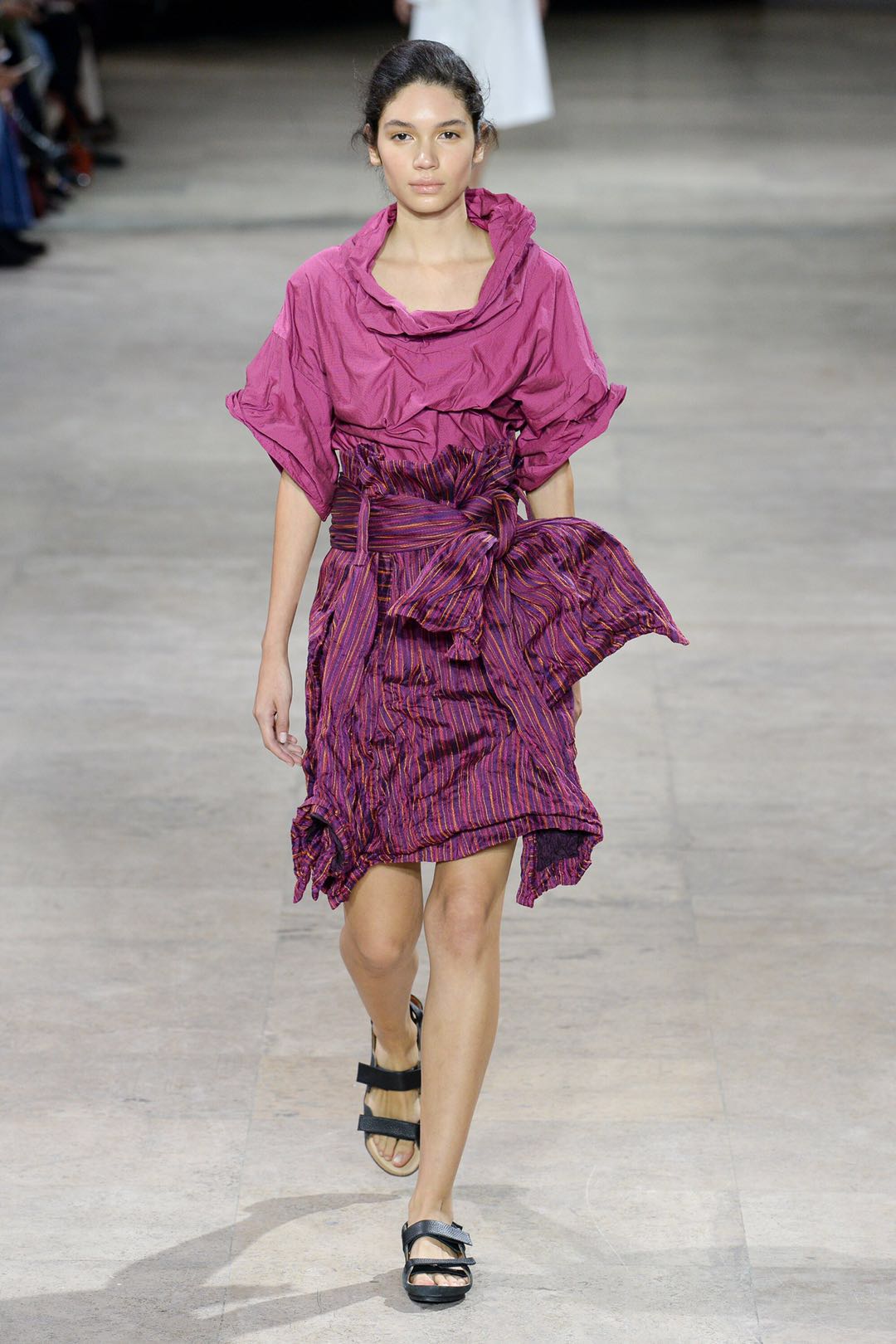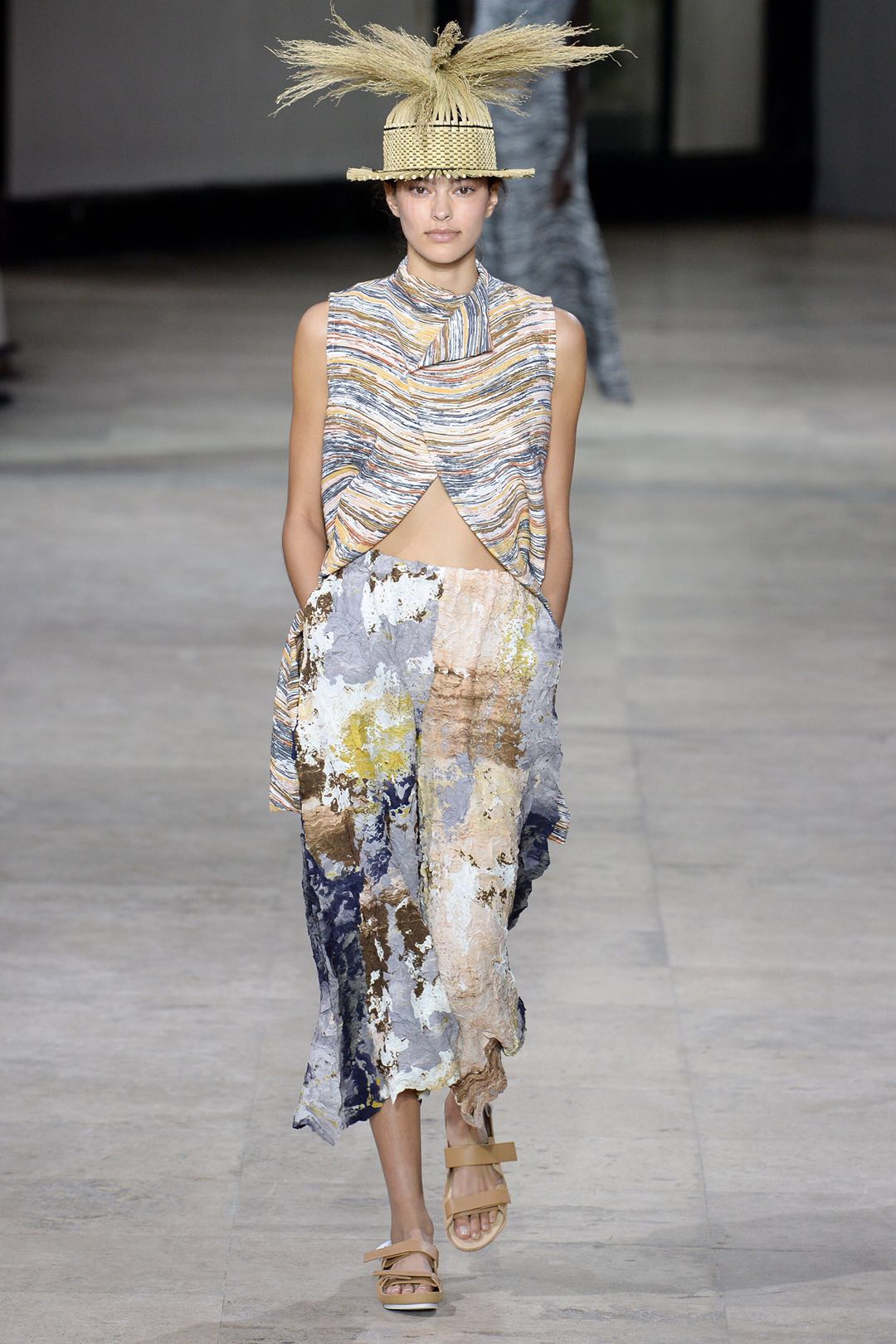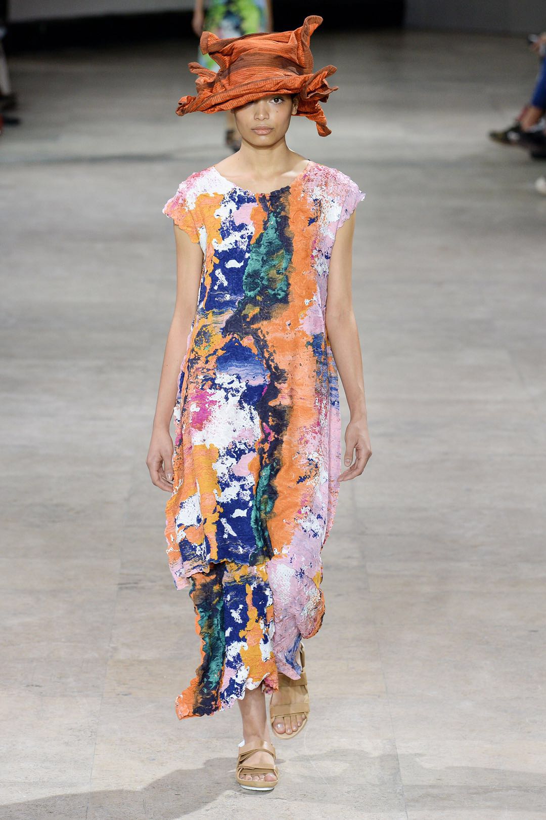 本季,三宅一生玩了点有趣的东西。帽子、胸衣和裙子等款式中可以看到,有种竖型条纹、看上去有些坚硬的材质。这种材质中混合了聚氨酯网,可以随意弯曲其形状。因此,穿着者可以根据自己喜欢的造型天马行空地对这种面料进行创作,如果技术够好的话,也许可以一物多用。这种材质被称为“面团”,是三宅一生与新面料工作一起研发的新材质。
