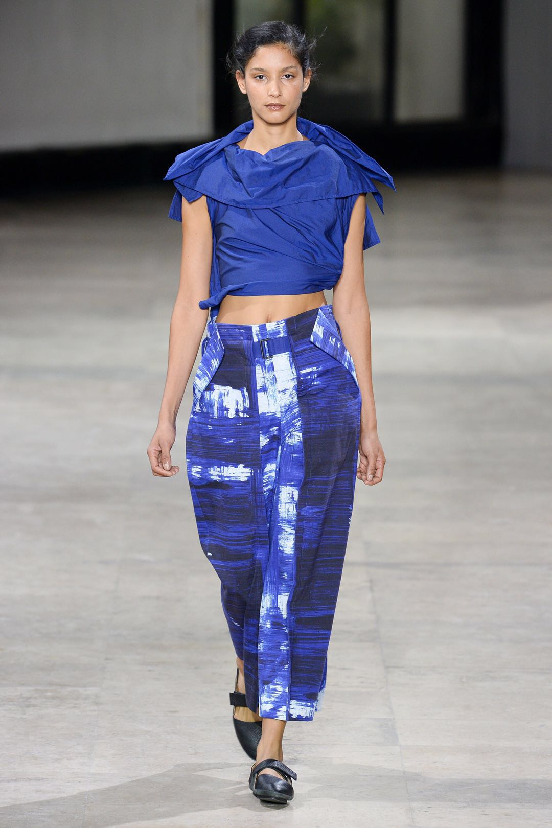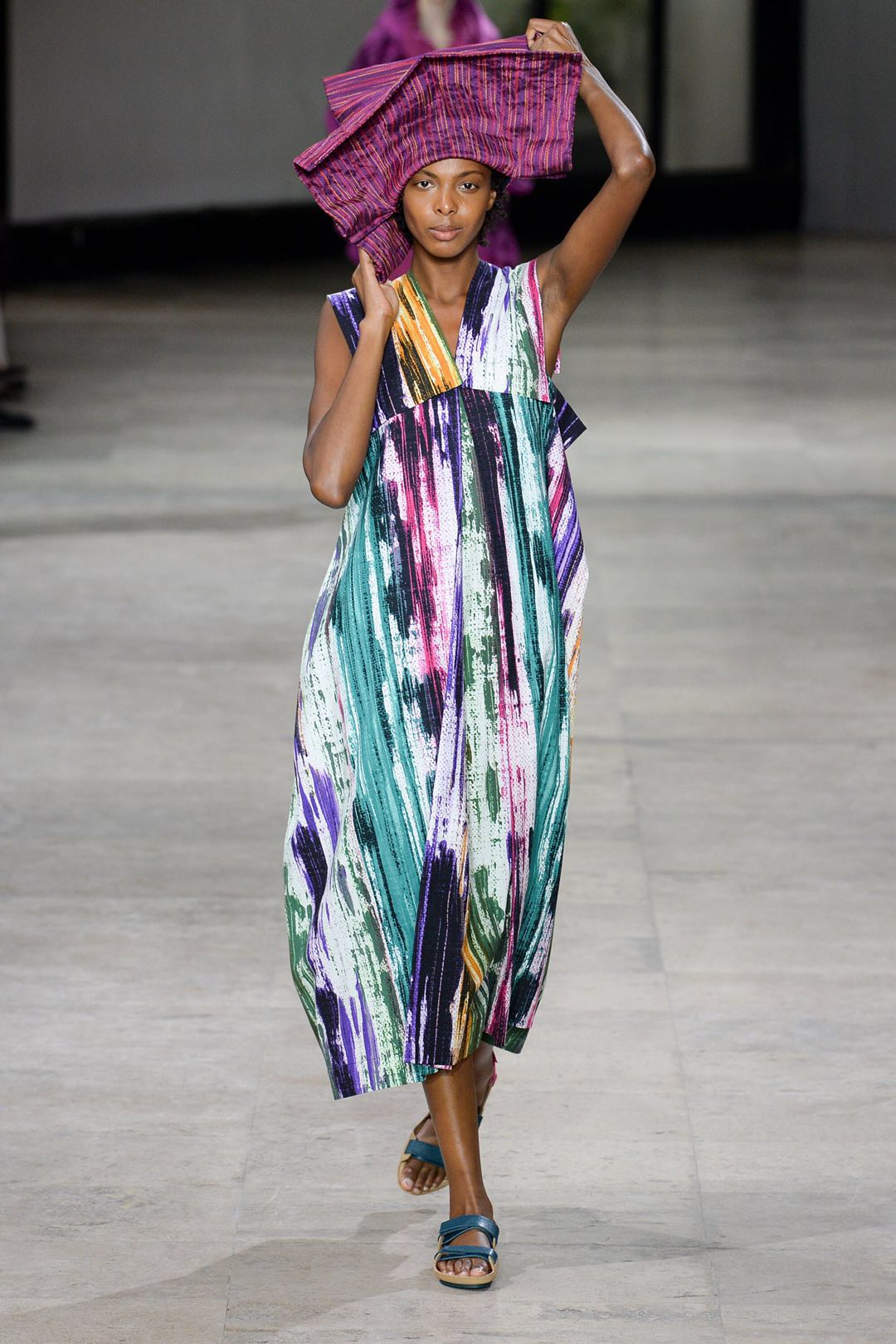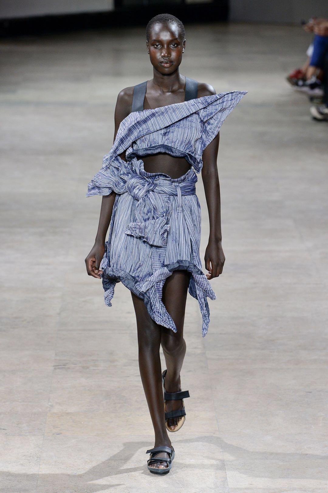 本季,三宅一生玩了点有趣的东西。帽子、胸衣和裙子等款式中可以看到,有种竖型条纹、看上去有些坚硬的材质。这种材质中混合了聚氨酯网,可以随意弯曲其形状。因此,穿着者可以根据自己喜欢的造型天马行空地对这种面料进行创作,如果技术够好的话,也许可以一物多用。这种材质被称为“面团”,是三宅一生与新面料工作一起研发的新材质。