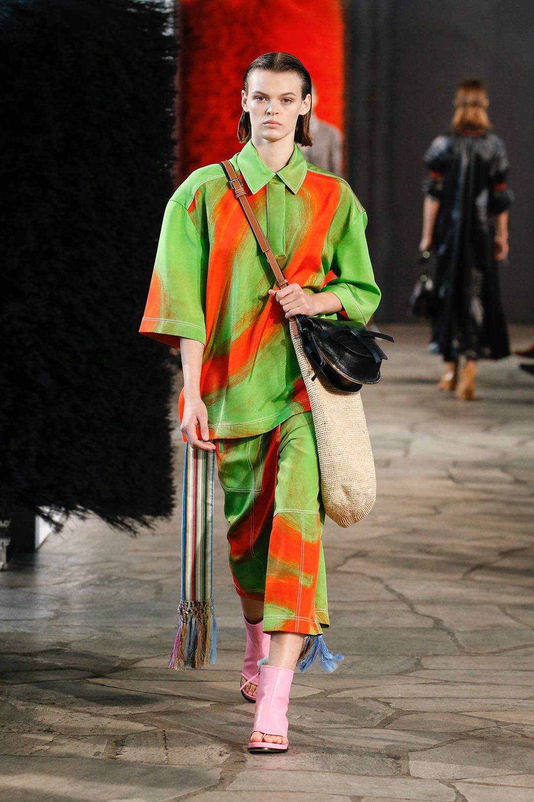 Loewe 2019春夏系列以联合国教科文组织大楼作为秀场,一些早期现代主义的艺术装置摆设其中。Lara Favaretto的旋转洗车刷、小井良治的旋转陶瓷唱片,还有一件漂浮着气泡的房间。创意总监Jonathan Anderson把秀场视作伦敦的著名动感艺术画廊“Signal(信号)”,体现了对手工工艺的探索,而激发他这一灵感的是行走在画廊中的人。