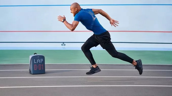 把背包立在跑道上,即刻化身为一个计时器帮助完成跑步训练。