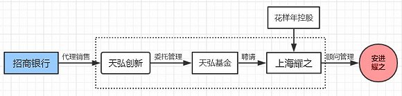界面新闻记者梳理产品说明书发现,上述私募基金产品宛如一个“套娃”:成立于2016年3月7日,管理人为天弘创新资产管理有限公司,为天弘基金旗下子公司,委托母公司天弘基金管理有限公司进行管理,投资顾问为上海耀之,托管人为招商银行上海分行,招行同时作为独家代销机构。