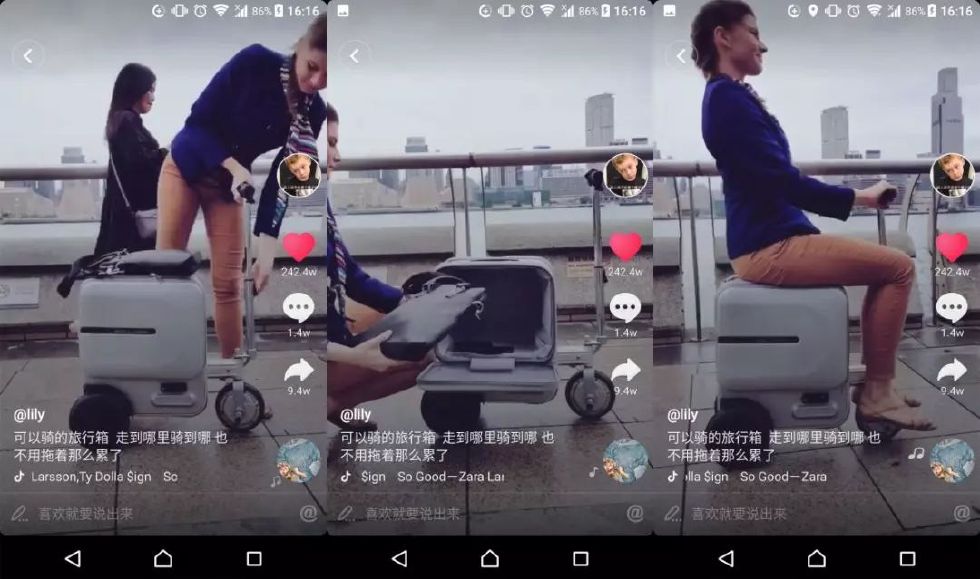 直到最近,黑莓酱在抖音上刷到过一个短视频,是一个小姐姐骑着行李箱出行的。