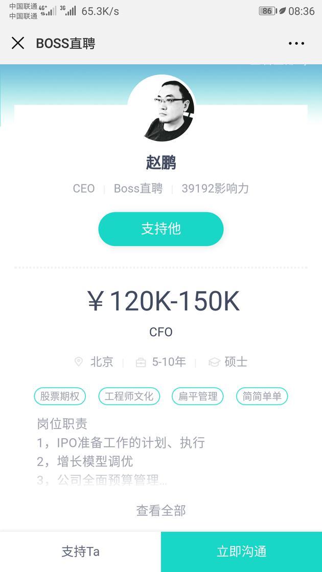 今年的上市潮名单里又添加了一个新公司,Boss直聘CEO赵鹏在自家平台上发布信息,要招聘“互联网科技公司完整IPO经验”的CFO,预备上市的心态已经很明确了。当然,上市是一个复杂且专业的工作,现在二级市场的表现不乐观,最终能否成功也是问题。