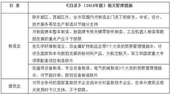 例如,在制造业中,除东城区和西城区外,全市范围内对研发、中试、设计、技术服务等非生产制造环节均予以支持,不再列入禁限;对新能源车整车、新能源专用关键零部件、工业机器人制造等鼓励发展的重点产业不予禁限。