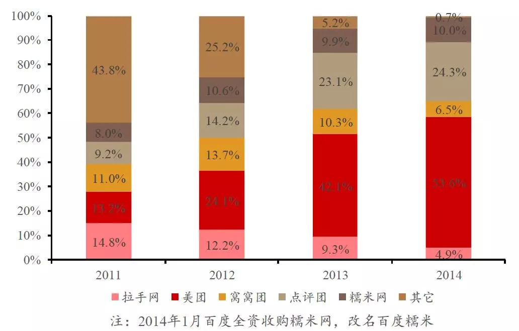 在四周年庆典的第三天,百度将2014年1月从千橡集团手中全资收购的糯米网更名为“百度糯米”,并成立全资子公司进行O2O布局。同时期,大众点评C轮、D轮融资金额超过1.6亿美元,O2O正式进入互联网寡头竞争状态。整个2013年,团购市场基本上没有发生大规模的融资行为,美团和大众点评依靠之前的融资,一样艰辛的过着日子。