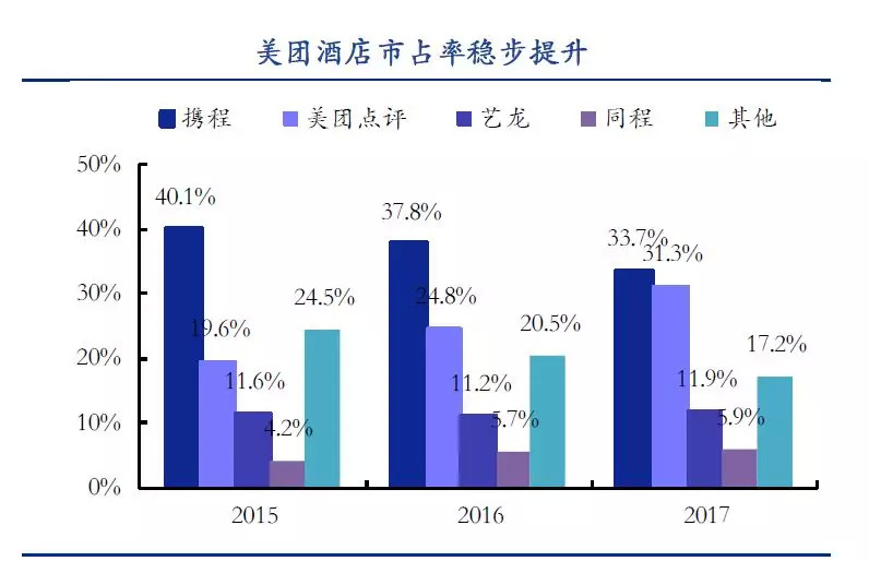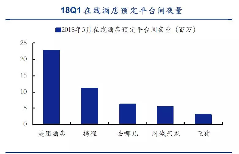 2018 年 3 月,美团酒店以 2270 万的单月间夜量首次超过携程、去哪儿、同程艺龙的总和。 2018 年第一季度,美团酒店以 5770 万的订单总量,位居行业第一名。