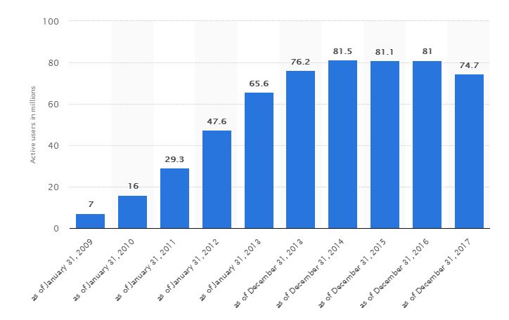 Pandora的活跃用户情况不容乐观。2014年,Pandora活跃用户数量达到最高值8150万,从2015年开始活跃用户呈下降趋势,2015年底比2014年底减少40万。到2017年底,Pandora活跃用户数量为7470万,为2013年以来最低值。