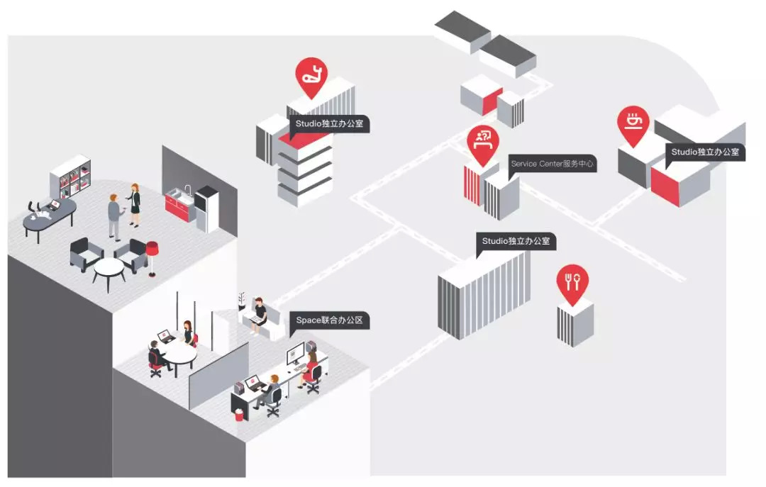 不过,“独立+联合”模式不是既做“独立”又做“联合”那么简单,而是要把“独立”和“联合”融合起来做,联合办公是中心,周围辐射数个超级工作室,这要求在一开始的空间布局上就有规划。