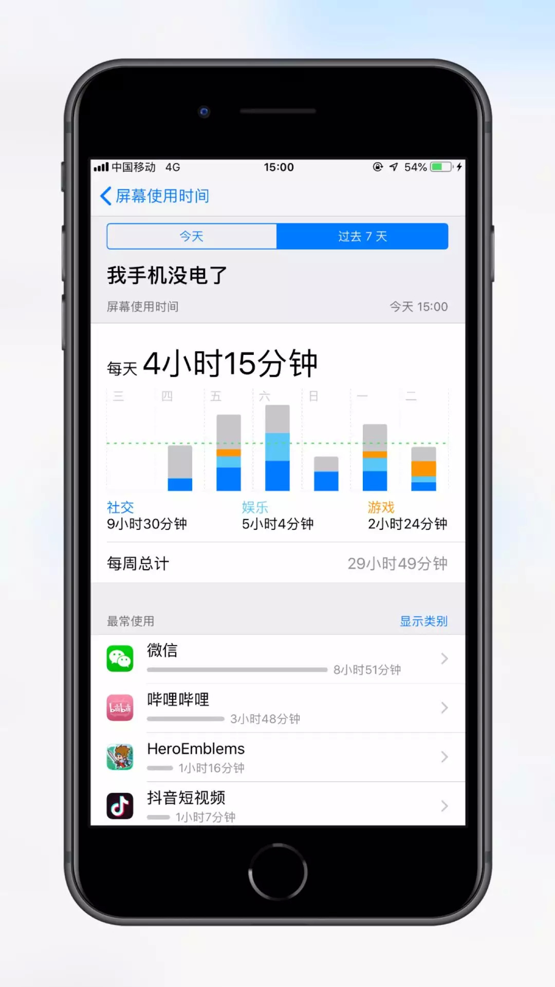 下面这份是世超上周的手机 APP 使用情况的统计图表。