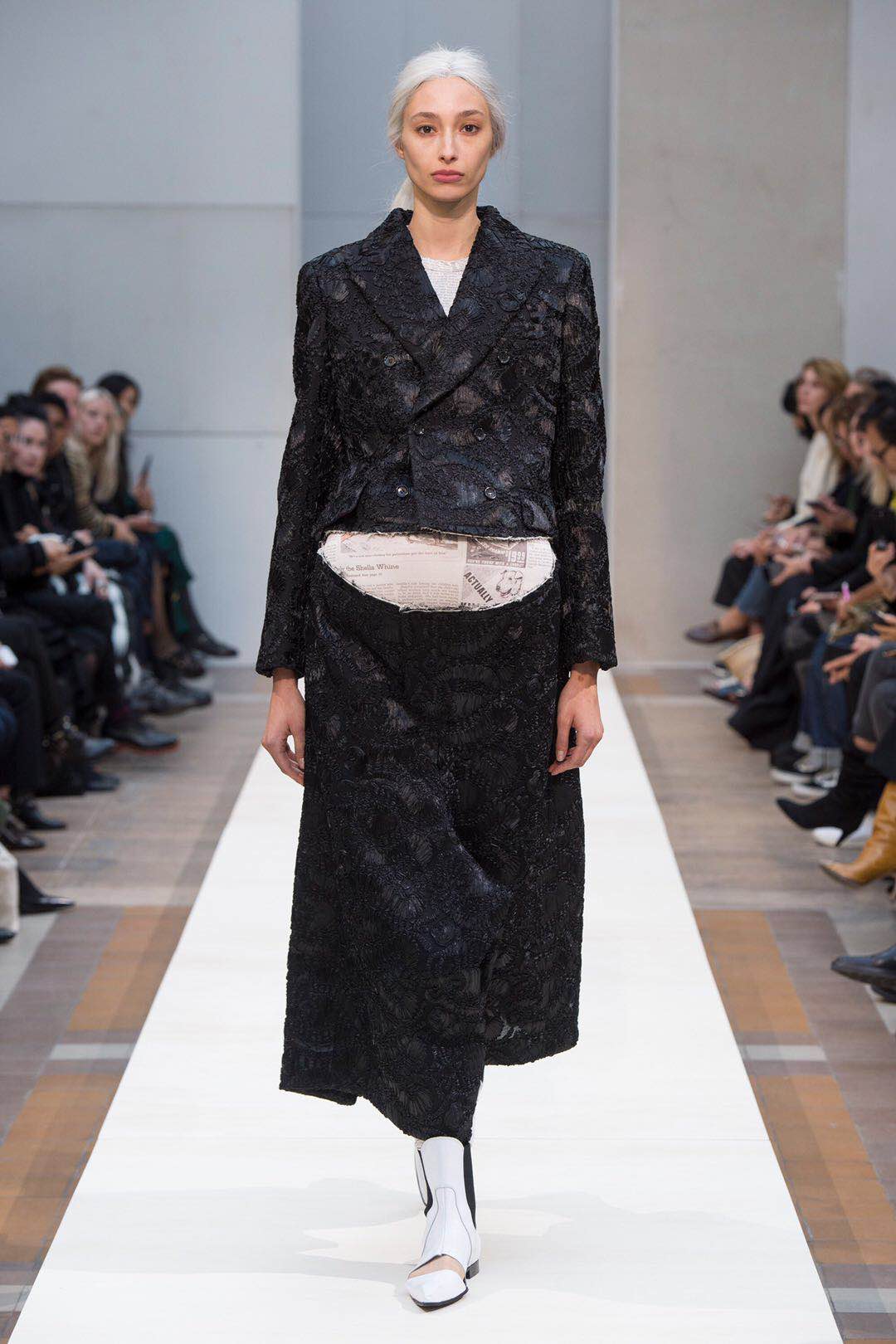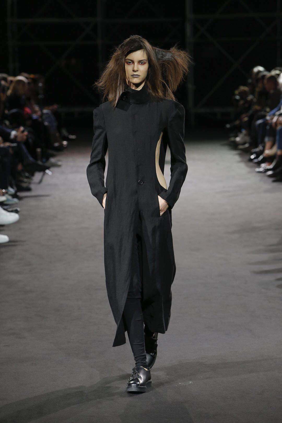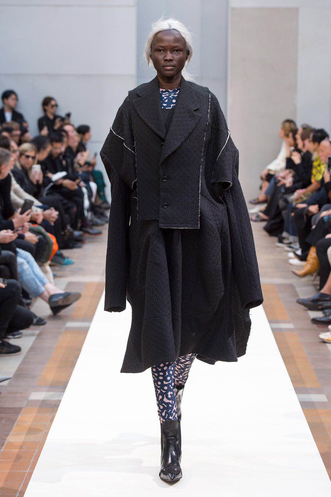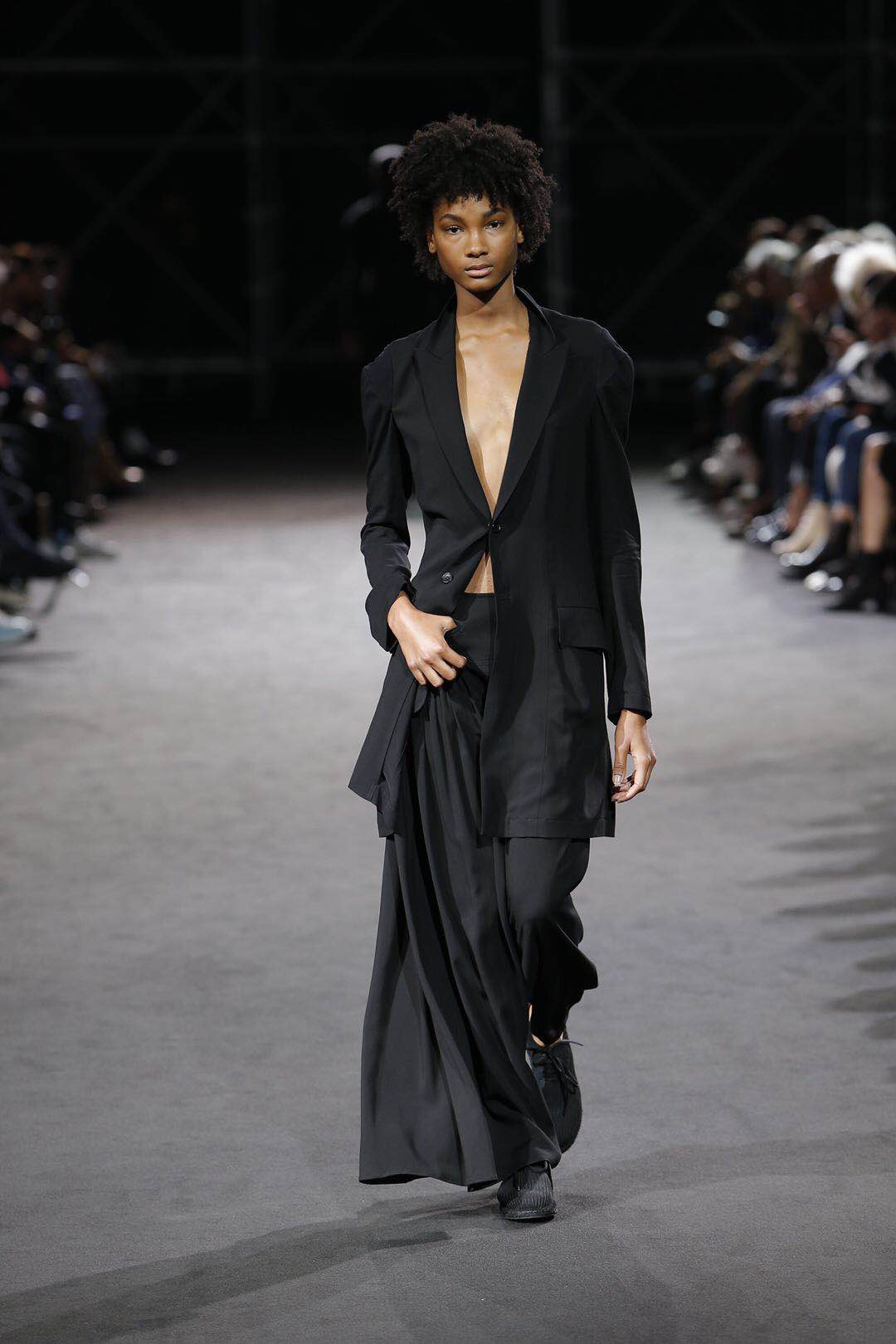 山本耀司在巴黎大皇宫的顶层画廊开辟了一块黑暗的场地,来描绘三种不同的主题。“反种族主义、反疯狂的全球变暖、反无性别时尚。”他在后台说道。近几季以来,山本耀司的想法是难预料的,有时流于表面,有时却过于深刻。不过他有自己的方向,那就是“回归男女着装的正常方式”。