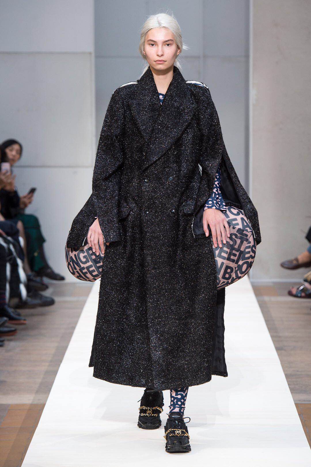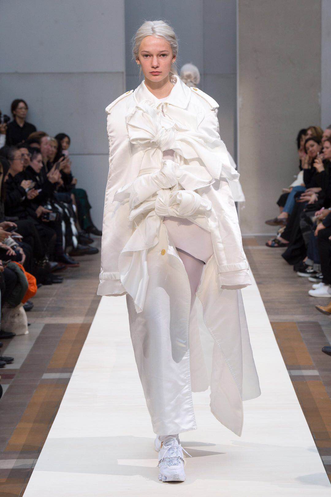 她的新尝试便是这场秀,描述了一个被所有人依赖的公司女老板形象。许多款式的腹部都鼓起,就像一个破壳鸡蛋一般,这种意向代表着创作者孵化内容的过程。还有一些隐藏在衣服下面的巨大锁链,象征着责任与束缚。值得注意的是,所有模特都带上了银白的假发,是一副步入老年的女性象征,很难说这不是川久保玲对自己经历的隐喻。她在坚持自我与突破桎梏之间挣扎,却最终迈出了那一步。