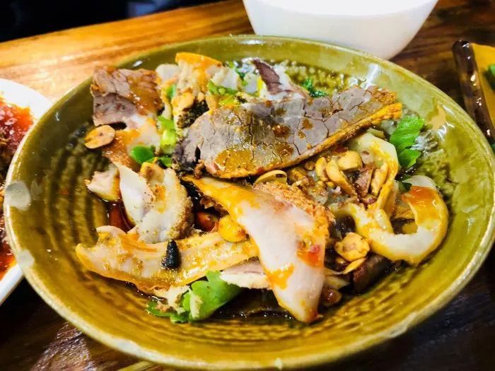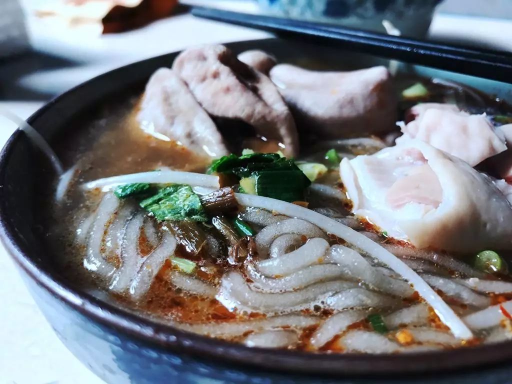 到底是老字号的肥肠粉,食客冲着小时候的感觉奔赴过去,看似清淡的非常拌入调料后十分入味,粉细致而顺滑,增加鹌鹑蛋等配菜又很有新意,搭配锅盔是标配。