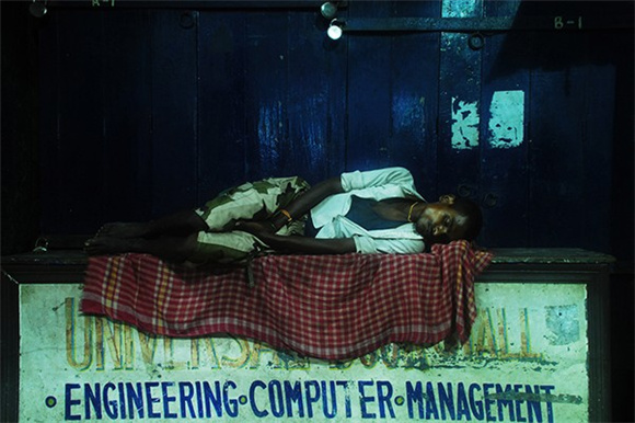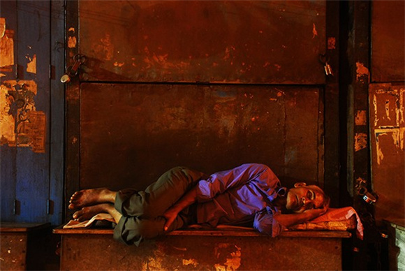 在学院街过夜的工人有一些会睡在固定的摊位,也有一些像来自比哈尔邦的Mangru Bind一样:25岁的Bind白天在学院街附近运输书本,晚上就把自己的手推车停在书报摊旁边,然后睡在上面。