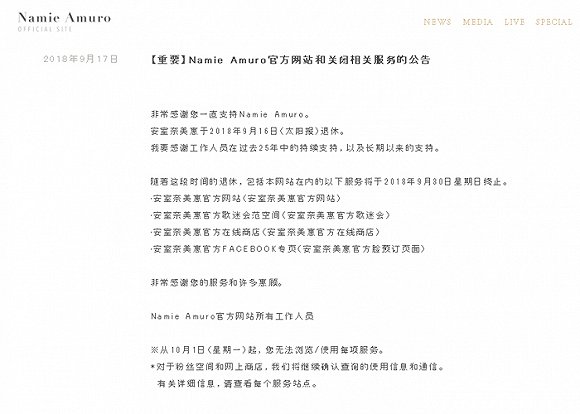 9月30日是安室奈美惠官方网站运营的最后一天,10月之后安室奈美惠的官方网站、视频网站、官网周边商店以及社交网站的安室奈美惠专页,所有的内容都将下架。
