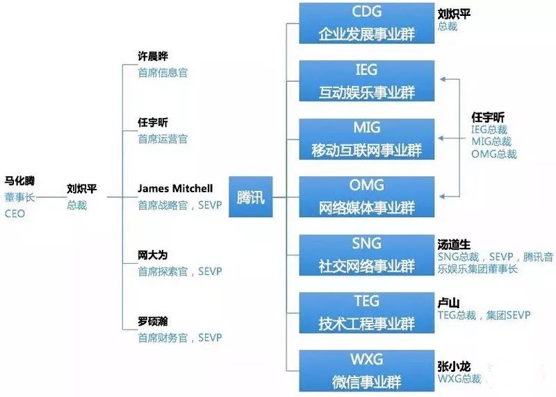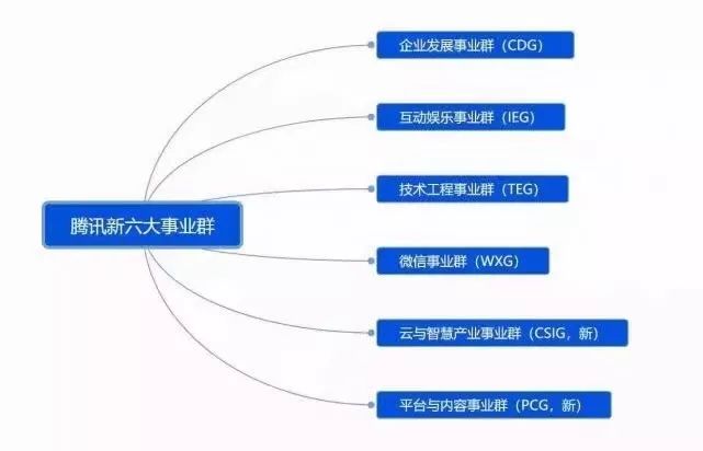 调整后,腾讯从原来的业务系统升级为事业群制,把业务重新划分为企业发展事业群(CDG)、互动娱乐事业群(IEG)、移动互联网事业群(MIG)、网络媒体事业群(OMG)、社交网络事业群(SNG),整合原有的研发和运营平台,成立新的技术工程事业群 (TEG),后续又将微信独立成立了WXG。