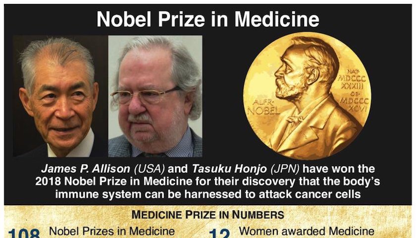 2018年10月1日,北京时间17时30分许, 美国免疫学家詹姆斯·艾利森(James P Alison)和日本免疫学家本庶佑(Tasuku Honjo)因为在肿瘤免疫领域做出的贡献,荣获 2018 年诺贝尔生理学或医学奖。