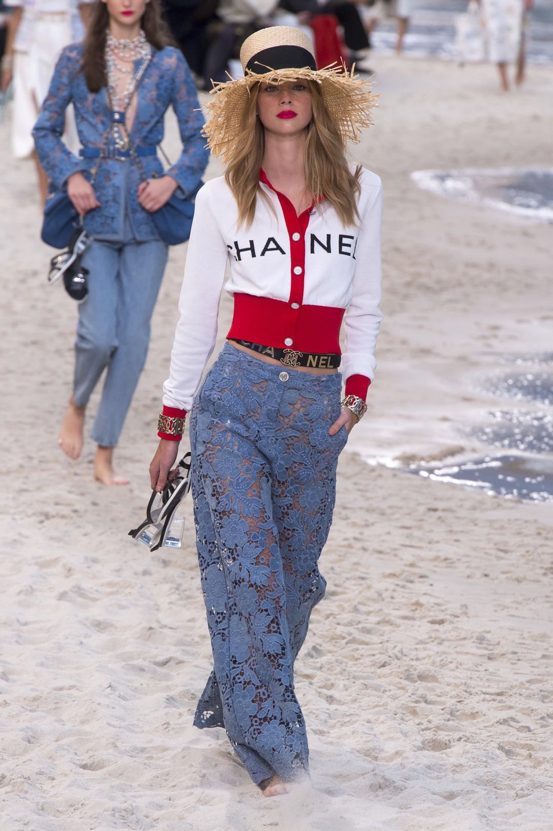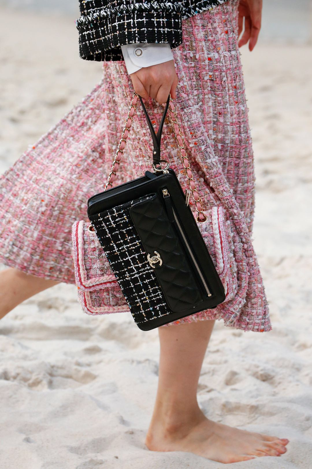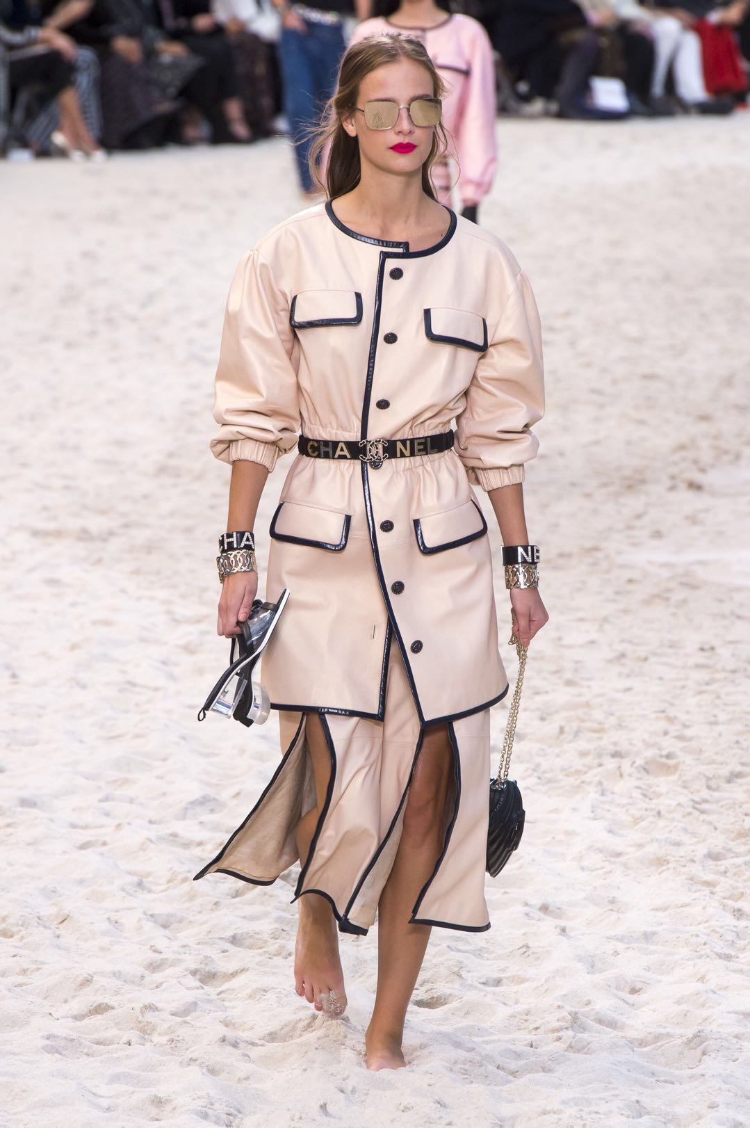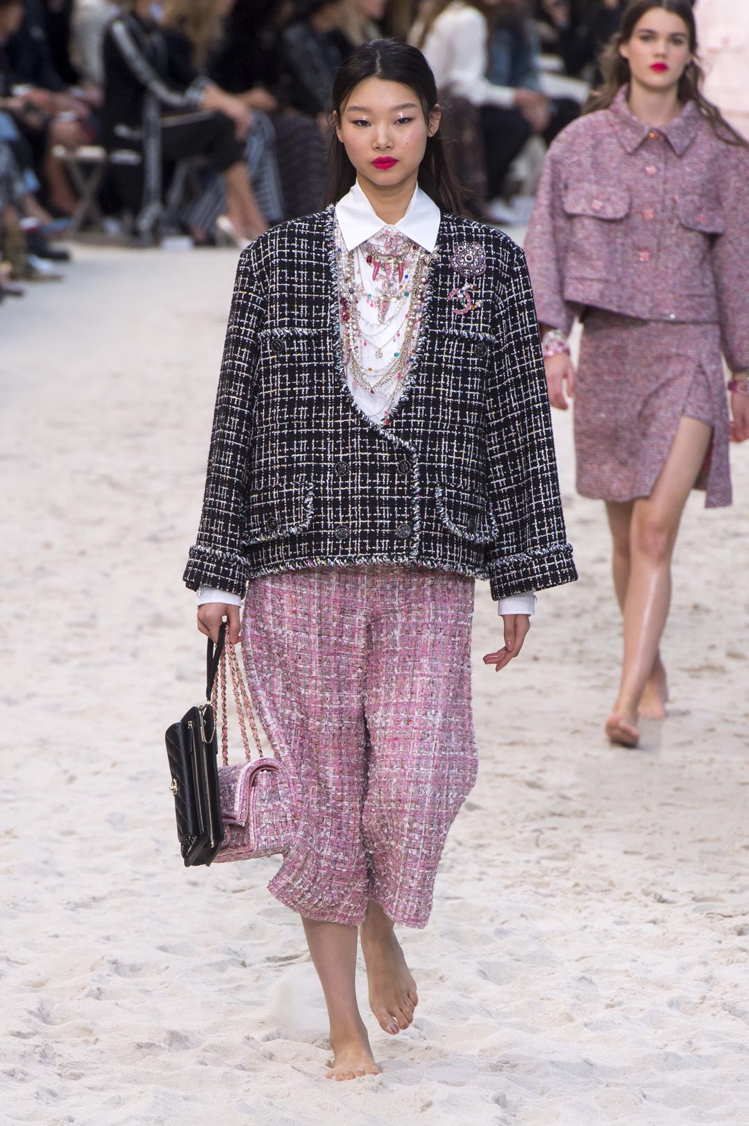 模特们提着鞋在沙滩上走过,毫不在意被打了折扣的完美腿长。在观众席之间的栈桥处绕个弯后,再优雅地穿上鞋子,从众人面前走过。这一动作几乎还原了所有女性在沙滩上心怀欣喜却又小心翼翼的样子——没有比夏日中光脚踩沙滩更享受的事了,但也不能湿了我的香奈儿。