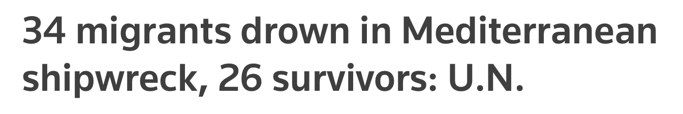 【联合国:地中海沉船造成34名难民丧生】联合国难民署周二援引摩洛哥海军和西班牙救援机构的消息称,一艘难民船在地中海西部海域沉船,至少34人丧生,26人幸存。