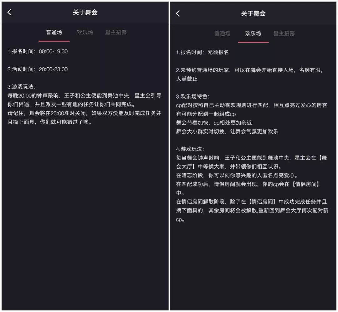 除了一个简单的角色扮演,接下来的“假面舞会”并没有再出现其他让人兴奋的活动。和对方“摘下面具“成为当晚限定时间CP后,我问他:“这个活动有趣吗?”“刚开始还觉得挺好玩,但后来就还好了。”已经连续参加一个月舞会活动的对方回答我。我追问为什么还要参加后,对方很快回复道,“无聊啊,特别无聊。”