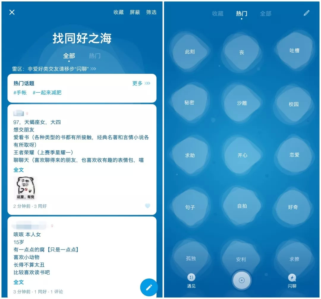 有关情绪、互动的“求助”、“找同好”等话题为一罐展现出了强烈和直接的社交属性。1.3版本更新中添加的“闪聊”系统承担了一罐开发团队对“实时社交”的希望。这个板块每次会显示10张不同用户的分身卡片,每张发布并限时展示30分钟的卡片都意味着“此刻想要聊天的人”。