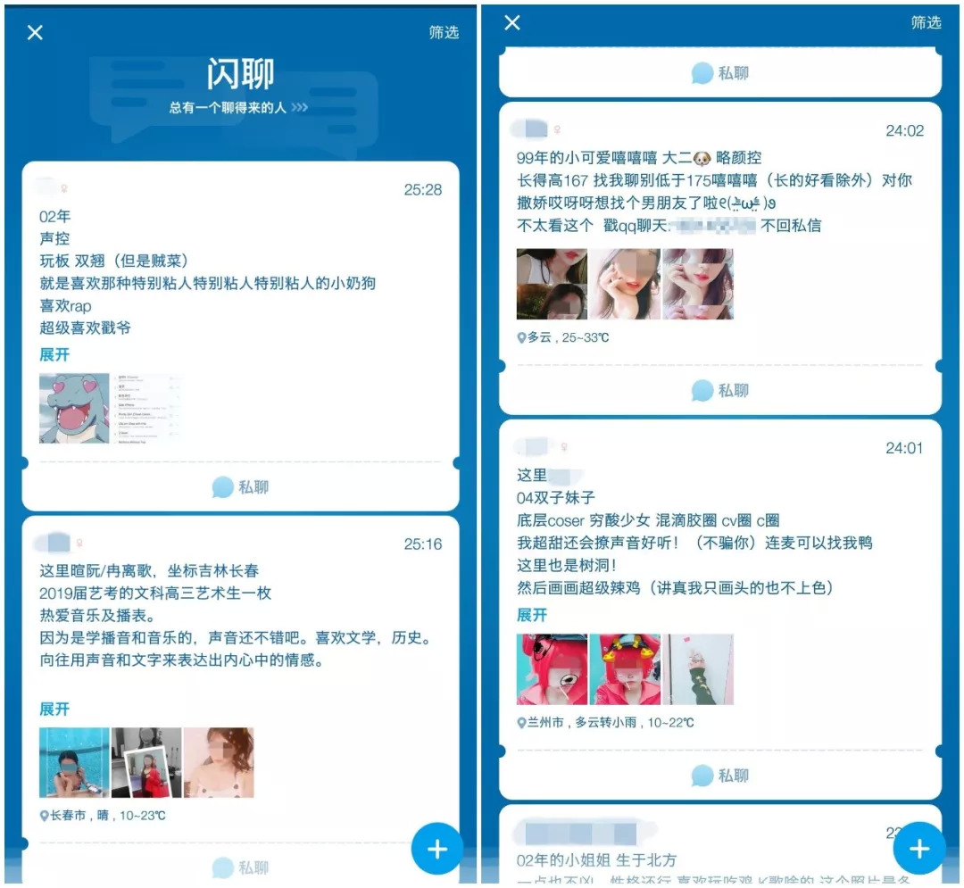 但是,我渐渐发现,在闪聊发布分身卡片的95后、00后们似乎没有暴露身份的担忧,他们在卡片上详细地介绍自己的身高、体重、年龄、星座、爱好等信息,甚至乐于分享个人照片。频繁更换ID、并想办法不透露有关实际身份的信息的做法,似乎只会出现在我这样的94年小姐姐身上。