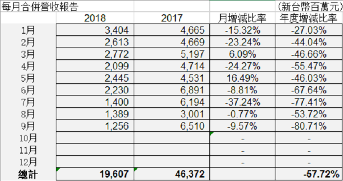 截至目前,该公司在2018年的收入为新台币196亿元(约合人民币43.5亿元),同比下滑了57.72%。