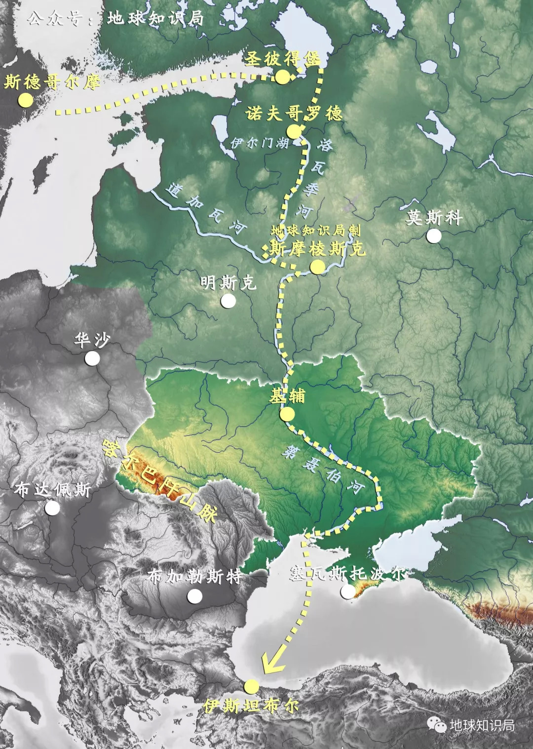 从方位上看,他们率先接触的应该会是拉脱维亚的母亲河道加尔河,但这个方向显然不能通向拜占庭。紧接着,他们又遇到了第聂伯河的上游源头,并且发现这条河的走向大致上是向南的,最终能够进入黑海,把商人们带到繁华的君士坦丁堡。