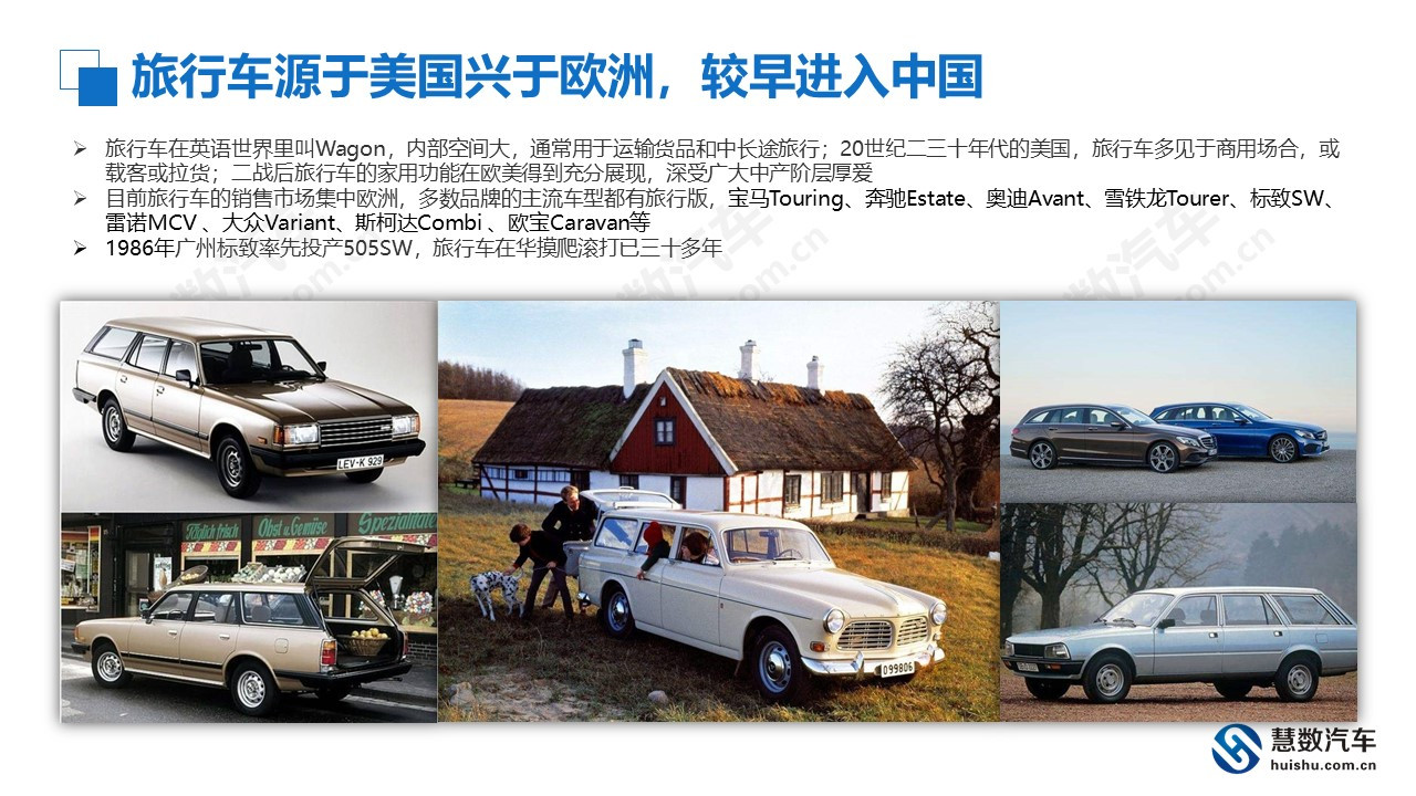 旅行车在英语世界里叫Wagon,内部空间大,通常用于运输货品和中长途旅行;20世纪二三十年代的美国,旅行车多见于商用场合,或载客或拉货;二战后旅行车的家用功能在欧美得到充分展现,深受广大中产阶层厚爱;目前旅行车的销售市场集中欧洲,多数品牌的主流车型都有旅行版,宝马Touring、奔驰Estate、奥迪Avant、雪铁龙Tourer、标致SW、雷诺MCV 、大众Variant、斯柯达Combi 、欧宝Caravan等;1986年广州标致率先投产505SW,旅行车在华摸爬滚打已三十多年。