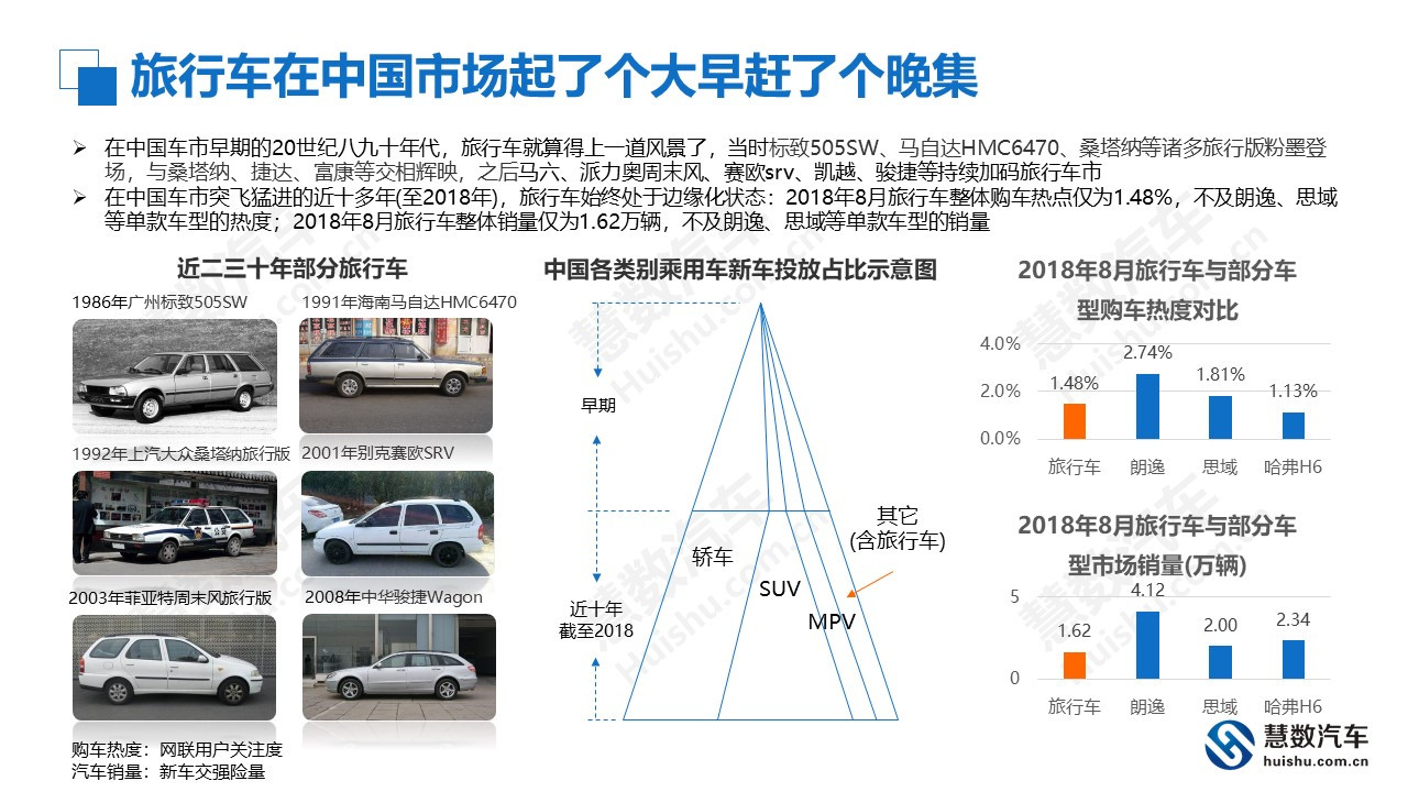 在中国车市早期的20世纪八九十年代,旅行车就算得上一道风景了,当时标致505SW、马自达HMC6470、桑塔纳等诸多旅行版粉墨登场,与桑塔纳、捷达、富康等交相辉映,之后马六、派力奥周末风、赛欧srv、凯越、骏捷等持续加码旅行车市;在中国车市突飞猛进的近十多年(至2018年),旅行车始终处于边缘化状态:2018年8月旅行车整体购车热点仅为1.48%,不及朗逸、思域等单款车型的热度;2018年8月旅行车整体销量仅为1.62万辆,不及朗逸、思域等单款车型的销量。