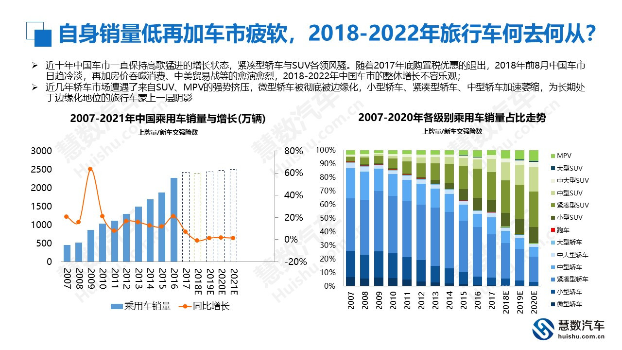 近十年中国车市一直保持高歌猛进的增长状态,紧凑型轿车与SUV各领风骚。随着2017年底购置税优惠的退出,2018年前8月中国车市日趋冷淡,再加房价吞噬消费、中美贸易战等的愈演愈烈,2018-2022年中国车市的整体增长不容乐观;近几年轿车市场遭遇了来自SUV、MPV的强势挤压,微型轿车被彻底被边缘化,小型轿车、紧凑型轿车、中型轿车加速萎缩,为长期处于边缘化地位的旅行车蒙上一层阴影。