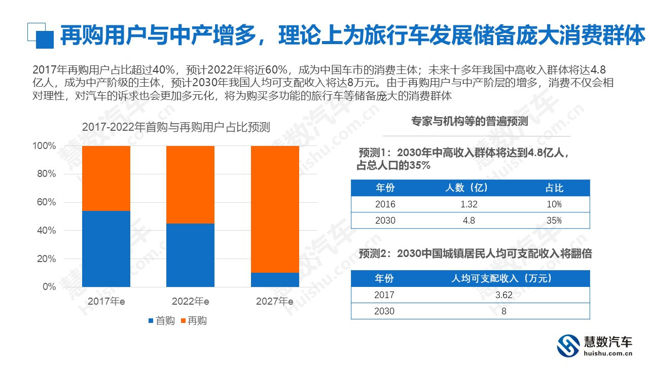 2017年再购用户占比超过40%,预计2022年将近60%,成为中国车市的消费主体;未来十多年我国中高收入群体将达4.8亿人,成为中产阶级的主体,预计2030年我国人均可支配收入将达8万元。由于再购用户与中产阶层的增多,消费不仅会相对理性,对汽车的诉求也会更加多元化,将为购买多功能的旅行车等储备庞大的消费群体。