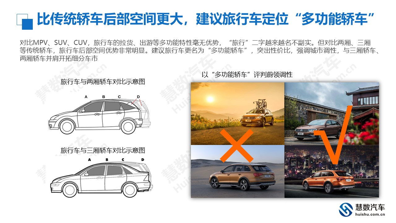 对比MPV、SUV、CUV,旅行车的拉货、出游等多功能特性毫无优势,“旅行”二字越来越名不副实。但对比两厢、三厢等传统轿车,旅行车后部空间优势非常明显。建议旅行车更名为“多功能轿车”,突出性价比,强调城市调性,与三厢轿车、两厢轿车并肩开拓细分车市。