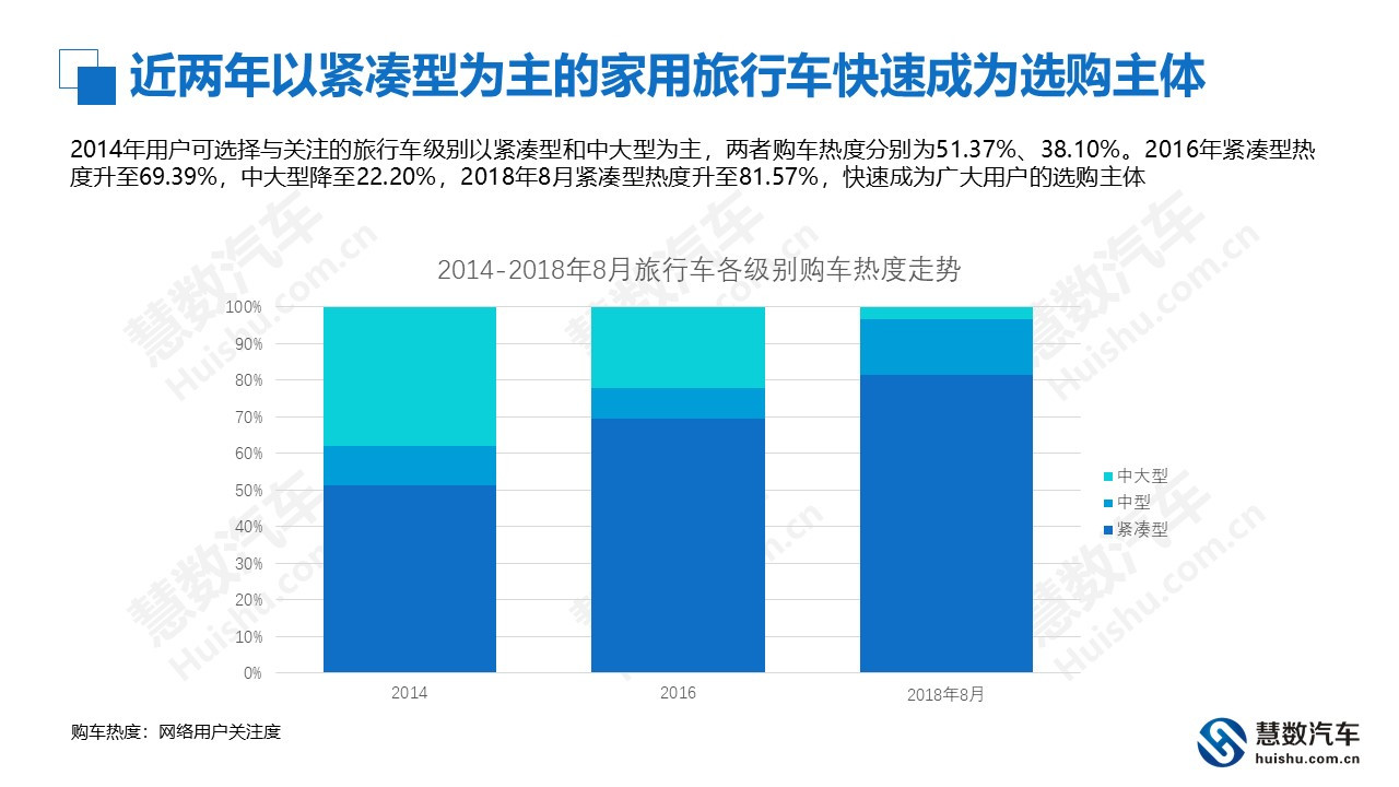 2014年用户可选择与关注的旅行车级别以紧凑型和中大型为主,两者购车热度分别为51.37%、38.10%。2016年紧凑型热度升至69.39%,中大型降至22.20%,2018年8月紧凑型热度升至81.57%,快速成为广大用户的选购主体。