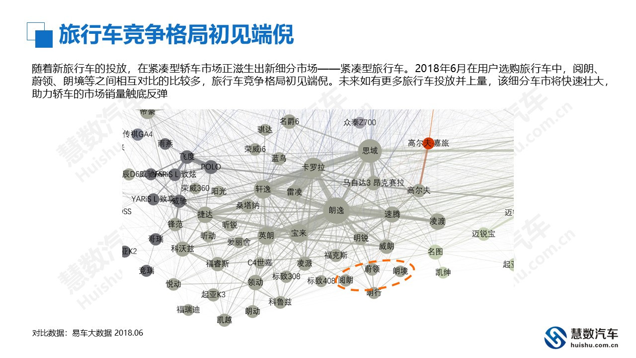 随着新旅行车的投放,在紧凑型轿车市场正滋生出新细分市场——紧凑型旅行车。2018年6月在用户选购旅行车中,阅朗、蔚领、朗境等之间相互对比的比较多,旅行车竞争格局初见端倪。未来如有更多旅行车投放并上量,该细分车市将快速壮大,助力轿车的市场销量触底反弹。