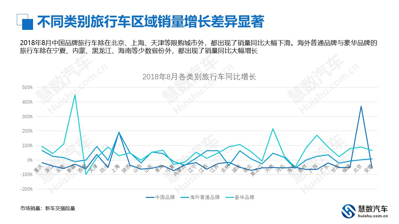 2018年8月中国品牌旅行车除在北京、上海、天津等限购城市外,都出现了销量同比大幅下滑。海外普通品牌与豪华品牌的旅行车除在宁夏、内蒙、黑龙江、海南等少数省份外,都出现了销量同比大幅增长。