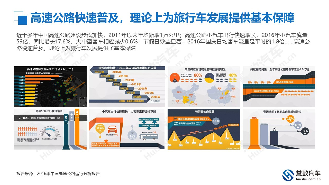 近十多年中国高速公路建设步伐加快,2011年以来年均新增1万公里;高速公路小汽车出行快速增长,2016年小汽车流量59亿,同比增长17.6%,大中型客车相应减少0.6%;节假日效益显著,2016年国庆日均客车流量是平时的1.8倍……高速公路快速普及,理论上为旅行车发展提供了基本保障。
