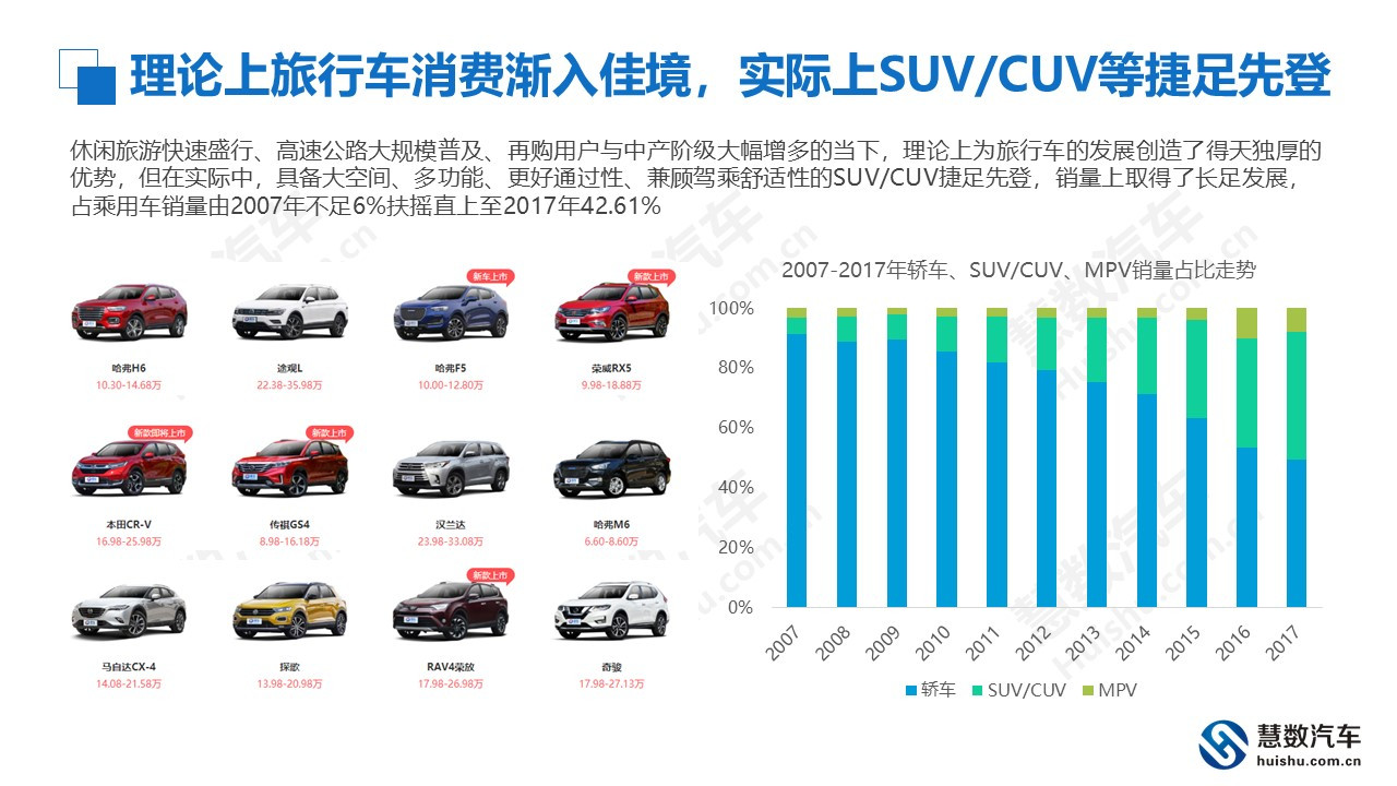 休闲旅游快速盛行、高速公路大规模普及、再购用户与中产阶级大幅增多的当下,理论上为旅行车的发展创造了得天独厚的优势,但在实际中,具备大空间、多功能、更好通过性、兼顾驾乘舒适性的SUV/CUV捷足先登,销量上取得了长足发展,占乘用车销量由2007年不足6%扶摇直上至2017年42.61%。